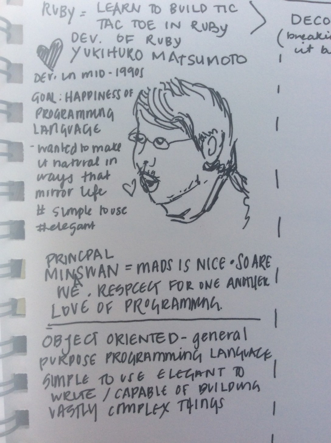 Part of the reason for this is because the developers and programming teachers are that way themselves. Through the Learn program I’ll be learning how to use Ruby a software program developed by Yukirihuro Matsumoto. The idea behind creating Ruby, for ‘Matz’, as programmers call him, was inspired by his philosophy of creating happiness in the “hmm” of programming language. His goal, when developing it in the mid-1990s was to create a program that was ‘simple to use and elegant to write’ and capable of building vastly complex things. It’s ‘object orientated’ or created as general purpose programming language. Most importantly it was based on the principal “madz is nice, so are we”–or MINASWAN, as it’s known in the Ruby community.